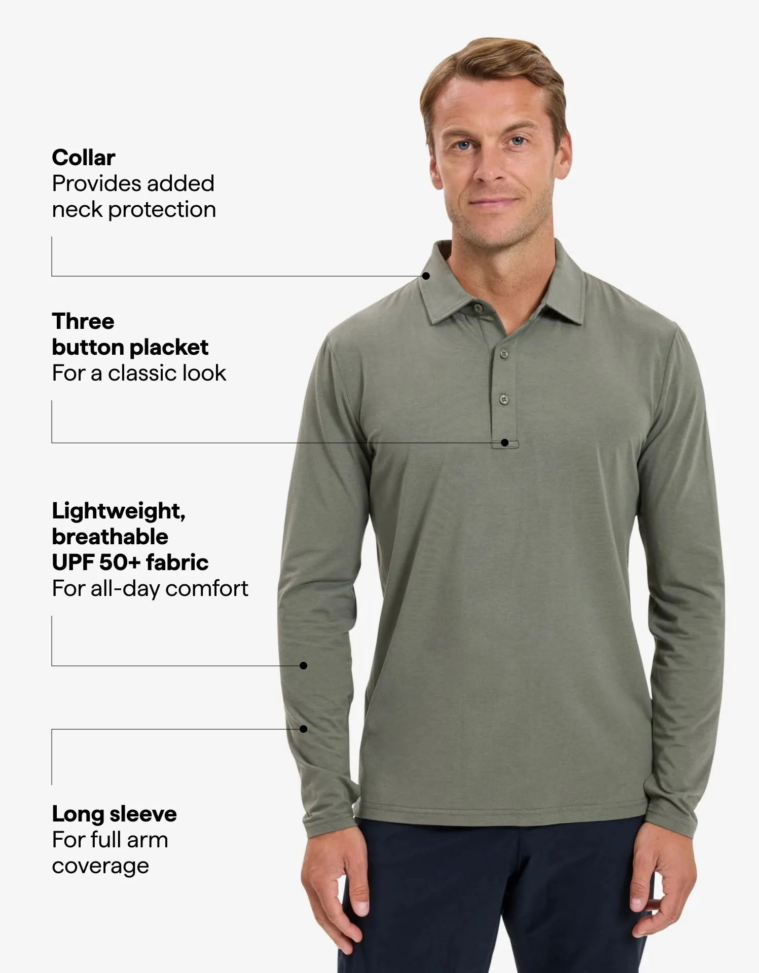 Our UPF 50+ Long Sleeve Sun Protective Polo Shirt for Men is made from a soft, natural cotton-bamboo blend that’s breathable, anti-odor, and gentle on the skin. Recommended for sensitive skin, it’s ideal for long days in the sun, including playing golf, walking, travel, and leisure.